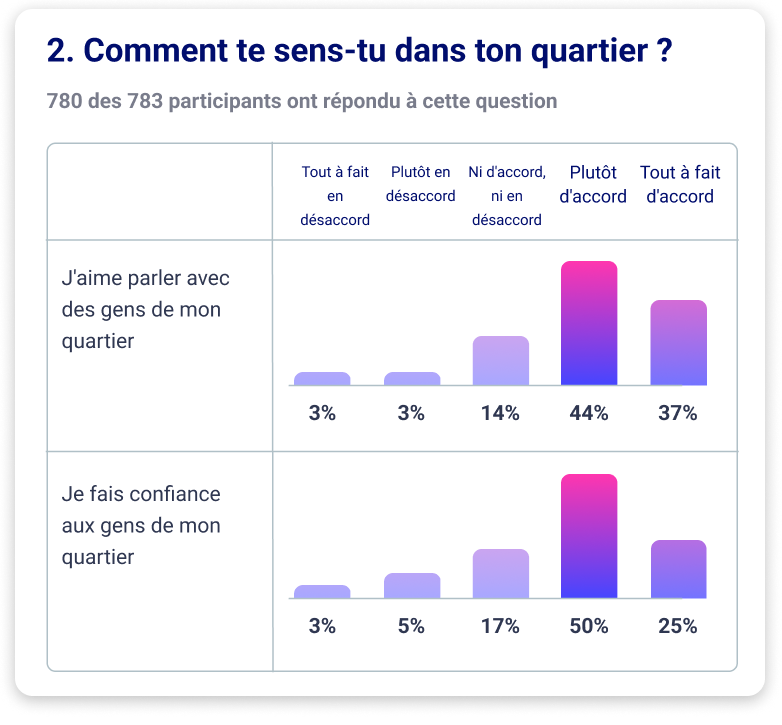 Mesurez comment les habitants vivent leur voisinage sur des thèmes tels que la qualité de vie, la connexion, la sécurité