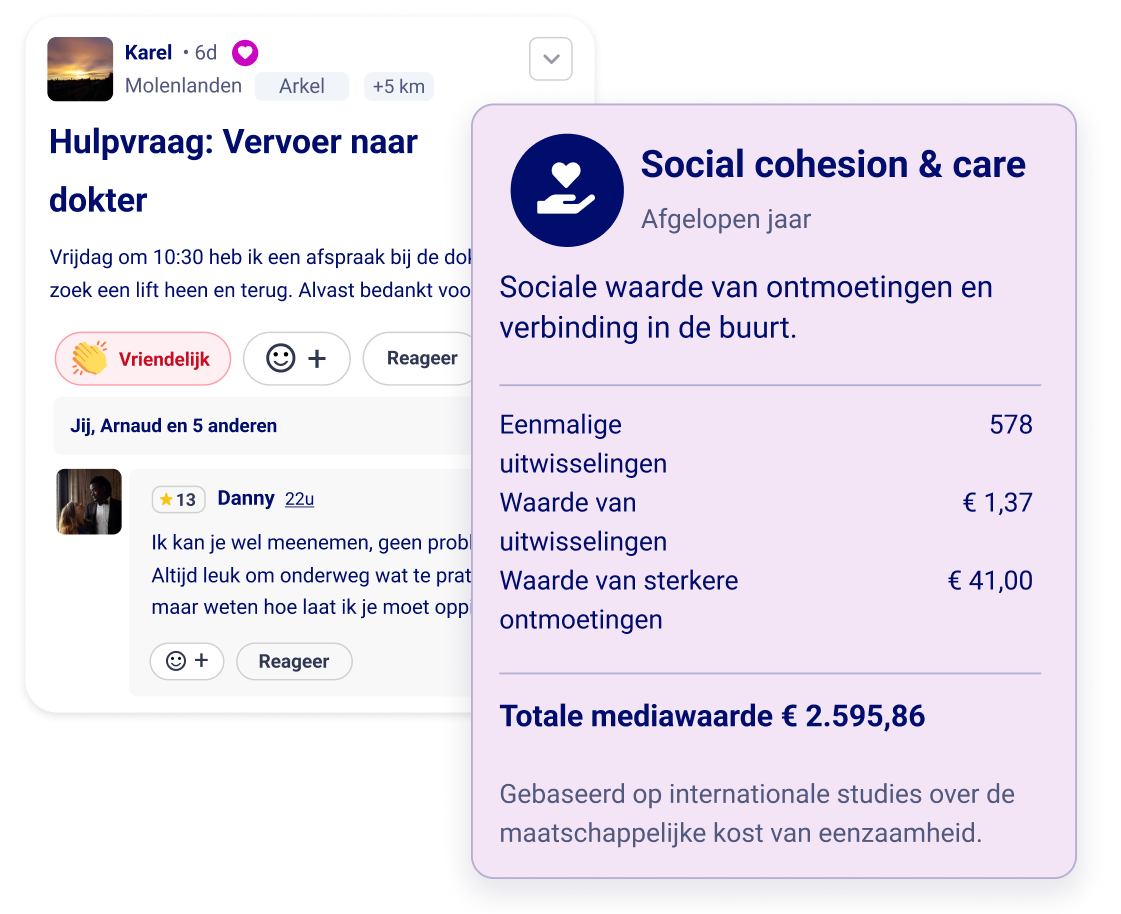 De logica: Gebaseerd op internationale studies naar de maatschappelijke kosten van eenzaamheid, berekenen we de waarde van hulpvragen en fysieke ontmoetingen.